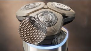 Cabezales compactos, flexibles y más pequeños con patrones de estiramiento de la piel que se adaptan dinámicamente a cada curva del rostro. Para un contacto constante con la piel con un 20% más de precisión* para atrapar el vello difícil en el cuello y debajo de la nariz para una precisión total.