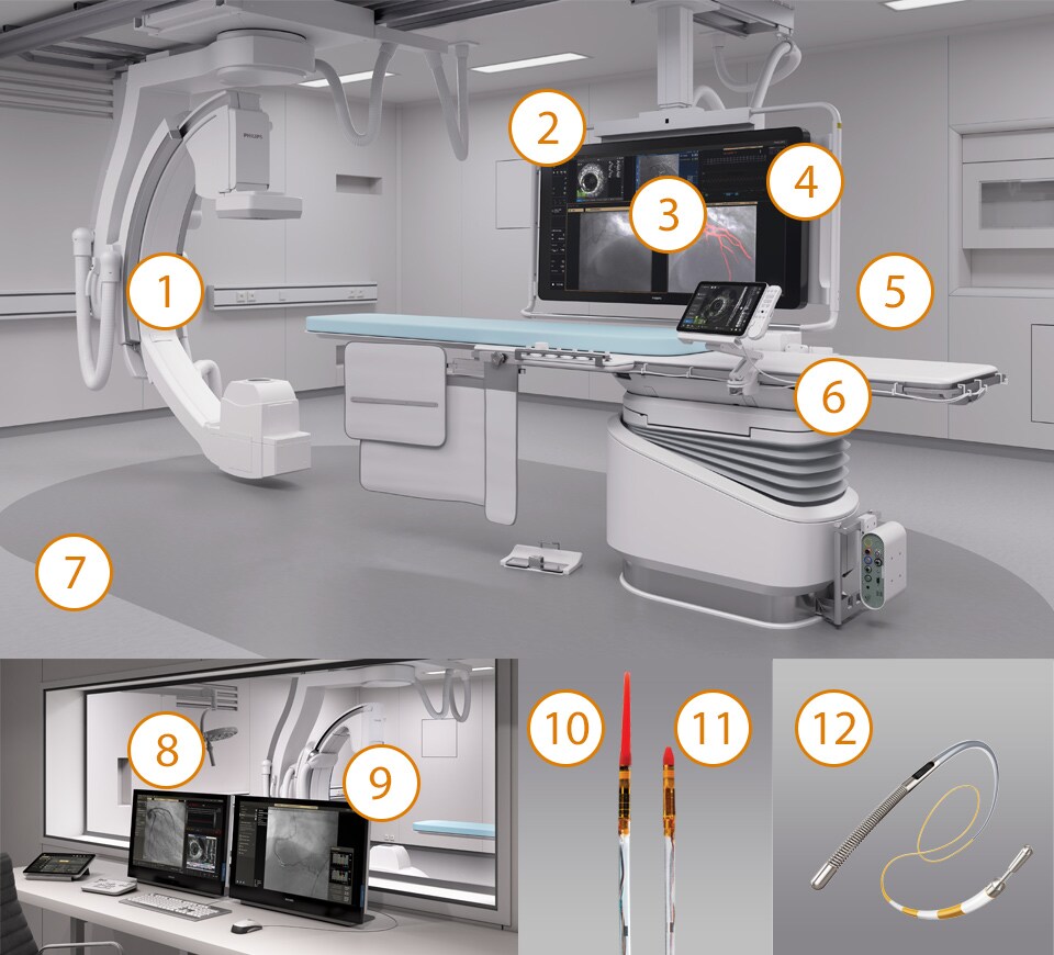 La terapia guiada por imagen, iFR, los ultrasonidos intravasculares y la monitorización hemodinámica, así como la planificación previa al procedimiento cardiaco y las aplicaciones avanzadas, están conectados a la interfaz de la terapia guiada por imagen para permitir la visualización, manipulación y configuración personalizada en el monitor desde un único módulo de control en mesa o desde la sala de control.
